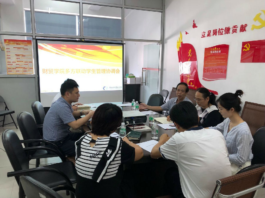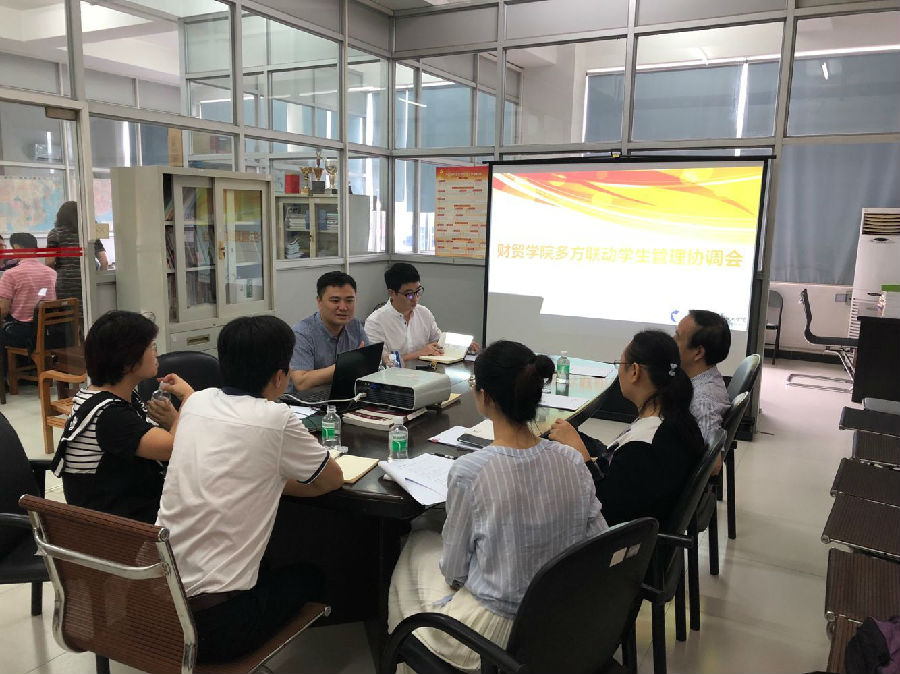 2019年5月14日下午14:45分,财贸学院在广州校区第二实训楼A503会议室召开多方联动学生管理协调会。教学督导室郑心成督导、财贸学院杨伟柱书记、易广副书记、王晓燕副院长、相关辅导员和班主任参加本次会议。会议内容围绕研究制定三校生班和澳财班教学和学生管理结合办法以及学业预警办法展开讨论;会议上郑督导就三校生班和澳财班学情做了信息反馈,并提出了相关管理办法的修改建议;学院书记、副书记、教学副院长、辅导员以及班主任也相继发言,共同为完善学生管理办法提出了建议。