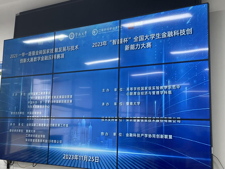 2023年11月25日,由金砖国家工商理事会中方理事会、一带一路暨金砖国家技能发展国际联盟、中国科协一带一路暨金砖国家技能发展与技术创新培训中心联合举办的“2023一带一路暨金砖大赛之数字金融应用赛项(“智盛杯”全国大学生金融科技创新能力大赛)决赛在线上成功举行。