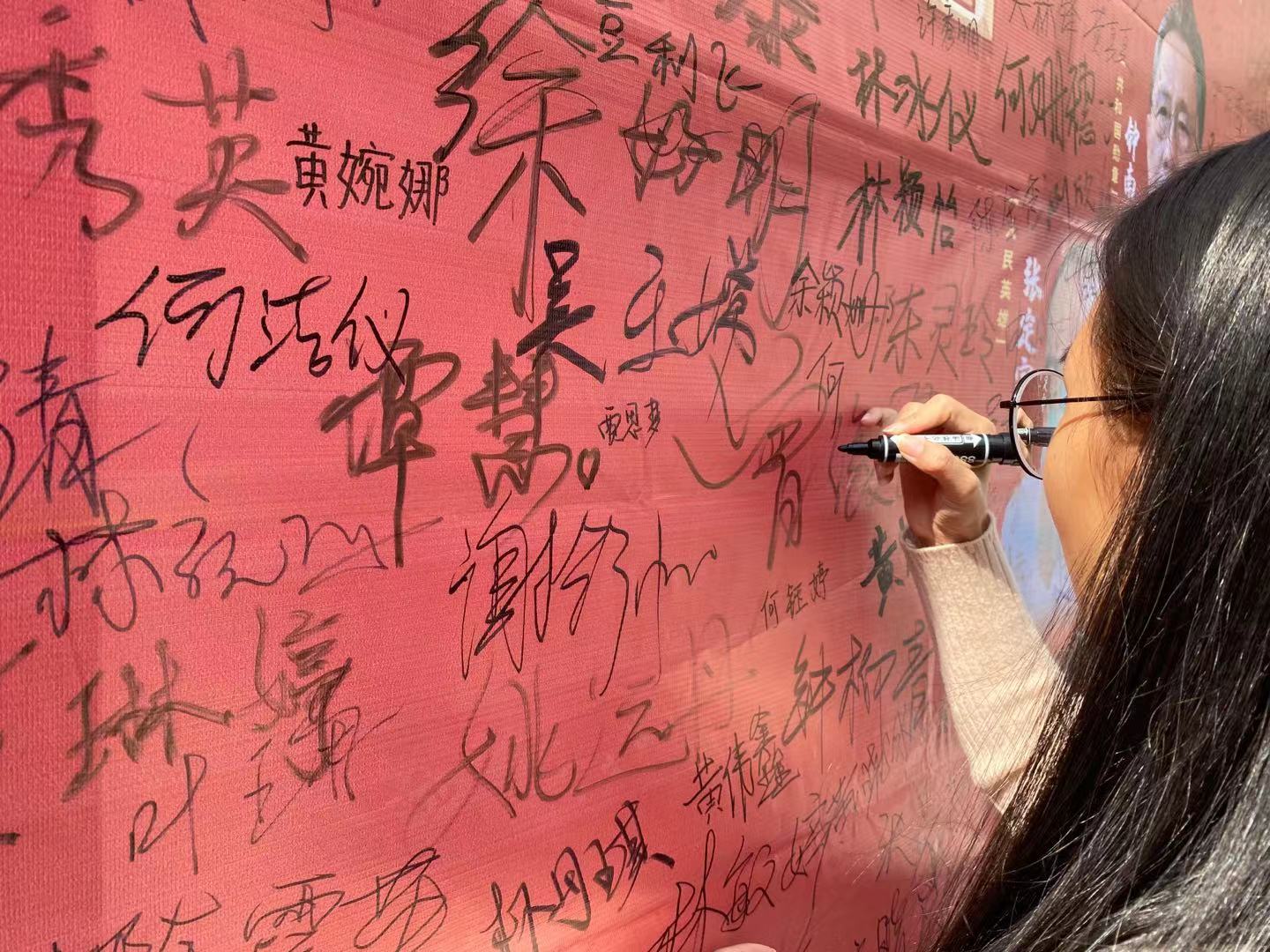 同学们在签名墙上一笔一划写上自己的名字,并郑重承诺在疫情防控期间做到自觉规范自己的行为,坚决执行防疫规定,学习抗疫英雄的先锋模范事迹。