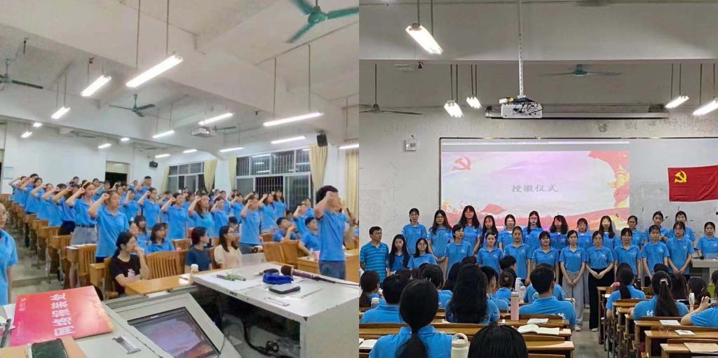 首先全体参会成员起立奏唱国歌,紧接着由黄静敏预备党员和钟漫丹、宋岭萍、林桂丽等54名发展对象通过PPT的形式依次汇报个人思想、学习、生活等方面的情况。接着,由班级代表和群众代表发表意见,对1名预备党员和54名发展对象提出意见和建议后,在场所有的党员进行无记名投票。投票结束后由财贸学院学生第二党支部书记蔡彬老师宣布支部决议以及投票结果。随后由在校学生党员代表刘少华同志带领转正的发展对象和预备党员进行入党宣誓。宣誓后,由财贸学院学生第二党支部书记蔡彬老师对通过的发展对象进行授徽。
