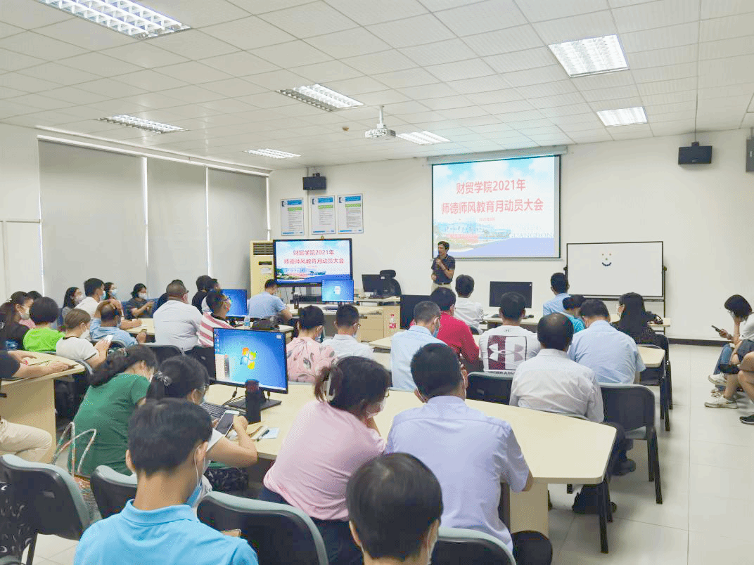 2021年8月28日,财贸学院在第二实训楼课室开展2021年师德师风教育月动员大会,本次大会由财贸学院党总支杨伟柱书记主持,财贸学院全体教师积极参与。