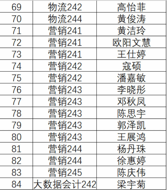 根据《关于做好2024-2025学年度国家奖学金、国家励志奖学金评审工作的通知》的要求,财贸学院坚持公平、公正、公开的评审原则,通过前期动员、政策宣讲、学生个人报名、班级评议推选、学院资格审查、学院评审小组评审等环节,最终拟推荐梁焕娟、张婷芸等84位同学获得2024-2025学年国家励志奖学金。具体名单如下: