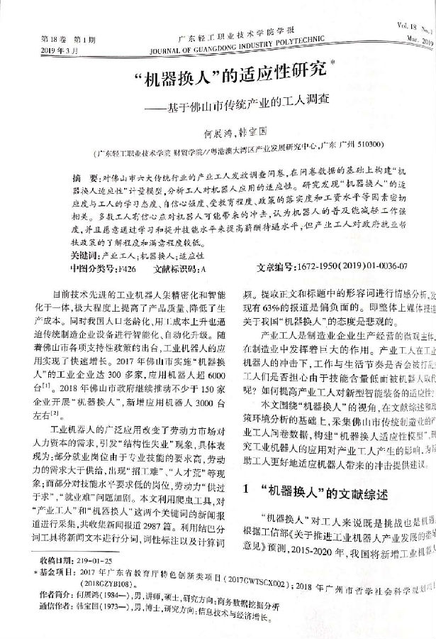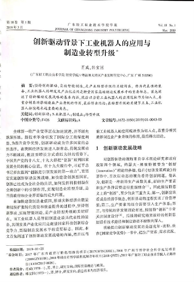 2019年第1期的《广东轻工职业技术学院学报》发表了"广东轻工职业技术学院粤港澳大湾区产业发展研究中心"的三篇研究论文,两篇是《智能制造:珠三角机器人应用现状及推进路径研究》课题的阶段研究成果,一篇是关于宽带骨干网络垄断厂商的规制问题研究,都紧扣产业发展研究主题。