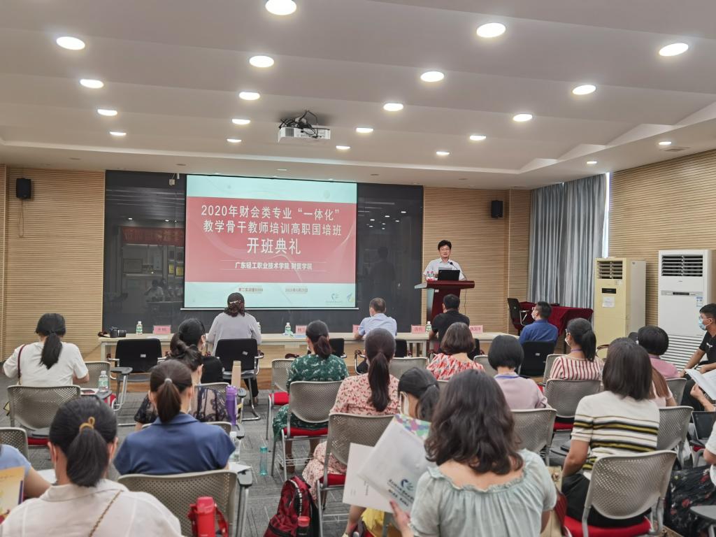 2020年6月29日上午,财贸学院在广州校区第二实训楼5楼B506路演大厅举办了2020年度国家级培训项目——财会类专业“一体化”教学骨干教师培训项目高职培训班的开班典礼。财贸学院院长韩宝国,副院长魏国平,金蝶精一信息科技服务有限公司广东省区院校合作部经理庞伟,广州番禺职业技术学院会计教研室主任刘飞,培训班项目负责人、班主任、工作人员以及全体参训学员参加了开班典礼,开班典礼由魏国平副院长主持。