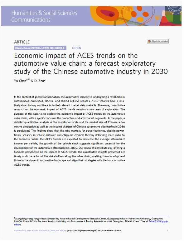 2024年6月,粤港澳大湾区产业发展研究中心陈钰副教授在《Humanities and Social Sciences Communications》期刊发表论文《Economic impact of ACES trends on the automotive value chain: a forecast exploratory study of the Chinese automotive industry in 2030》。该期刊是Nature旗下旗下唯一面向人文社会科学的子刊,致力于发表社会科学跨学科类和人文学科领域的高水平研究,被AHCI和SSCI收录,期刊影响因子为 3.7(期刊引文报告 (JCR) 2024 年发布),在JCR人文和社会科学分区为Q1。