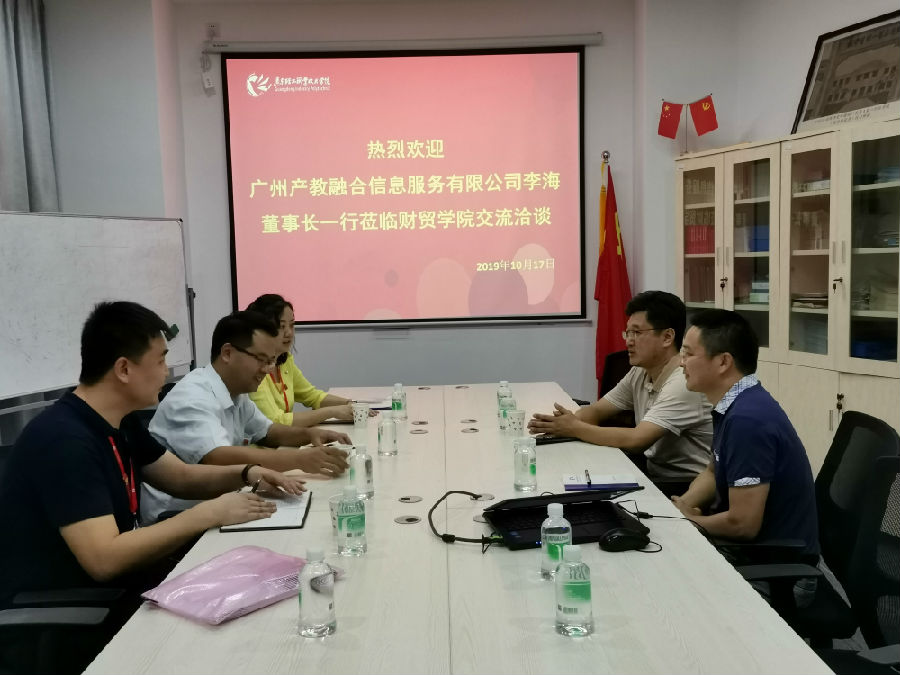 2019年10月17日下午,广州产教融合信息服务有限公司李海董事长等一行3人到访我院,我院韩宝国院长在第二实训楼B406接待了来访客人。