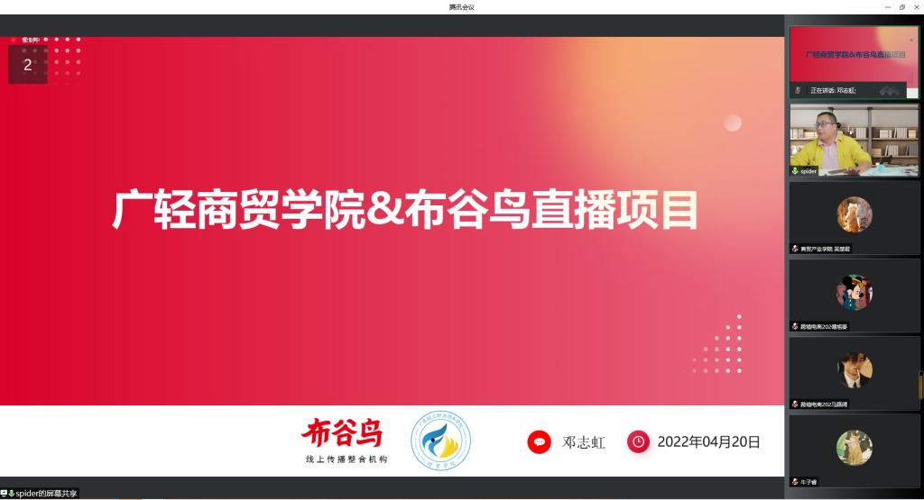 4月21日,商贸产业学院布谷鸟直播项目举行线上项目宣讲交流会。本次宣讲会嘉宾包括广州布谷鸟网络科技有限公司总经理刘永军、广州布谷鸟网络科技有限公司运营总监李伟、国贸教研室主任邓志虹、缪晨刚、肖威、吴楚君,以及来自跨境电商专业、电子商务专业、市场营销等专业的近100名同学。