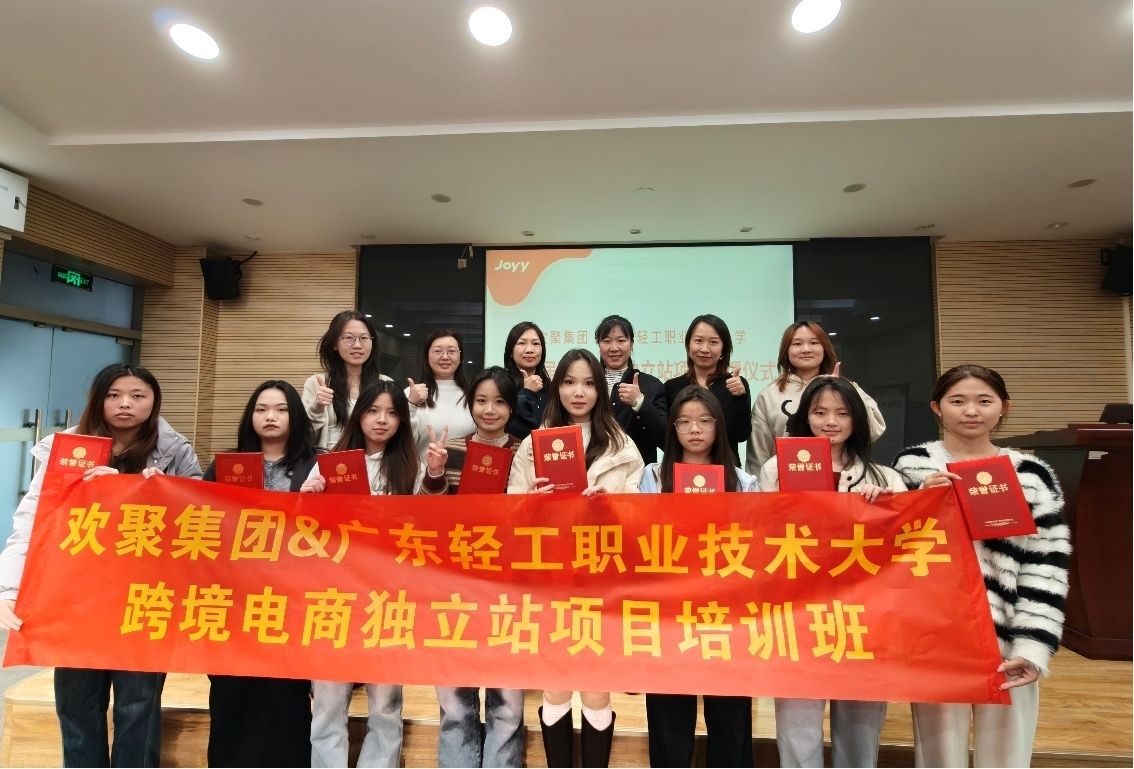 2026年1月8日,广东轻工职业技术大学实训楼 506 路演大厅内洋溢着热烈而庄重的氛围,欢聚集团与广东轻工职业技术大学联合举办的第四届跨境电商独立站项目结课仪式在此隆重举行。