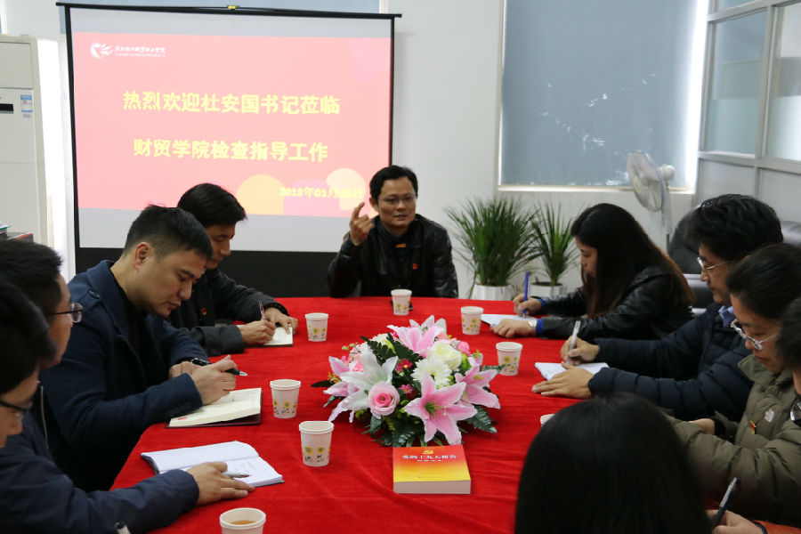 2018年01月08日上午,学校党委书记杜安国和组织部部长梁艳珍到财贸学院检查和指导党建工作。认真听取了总支书记杨伟柱和院长韩宝国对于党建工作、学院发展的情况汇报。