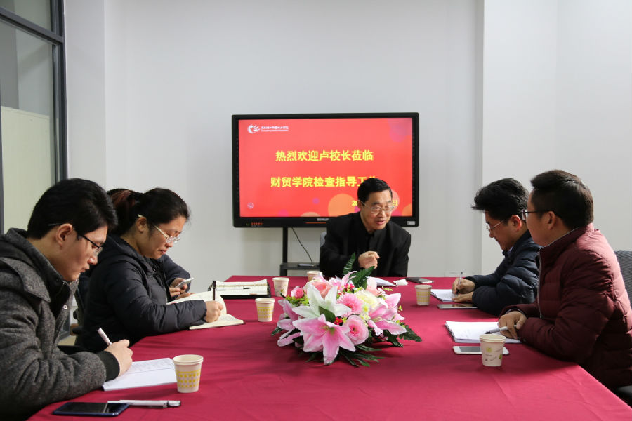 2018年01月10日上午,校长卢坤建和校办主任吴建材到财贸学院检查指导工作。在学院领导的陪同下,卢校长实地查看了学院办公室、各教研室和实训室等,并进行了座谈,认真听取了韩宝国院长对于学院发展建设情况的汇报。