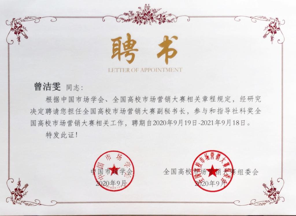 2020年9月19日,社科奖第十一届全国高校市场营销大赛全国总决赛线上总评审在北京圆满闭幕。我校财贸学院市场营销181蔡丽云,营销182梁苗苗、曹刘圆,电商181许醴元组成的“冲上云销”队,在曾洁雯、余海冰两位老师指导下,历经几轮选拔赛,成为广东省唯一的高职院校队伍进入全国总决赛。在总决赛舞台上,本专科学生同台竞技,我们参赛队伍获得二等奖,余海冰老师获得“优秀指导教师”称号,我校获“营销实践教学示范奖”。曾洁雯老师被聘请为全国高校市场营销大赛副秘书长。