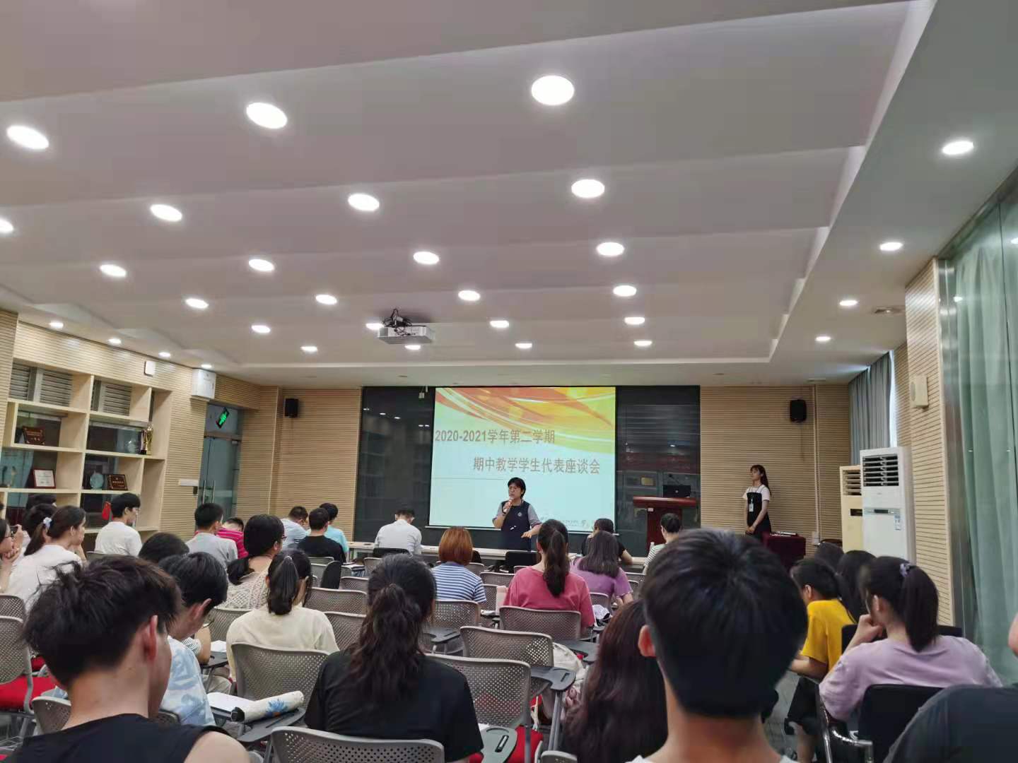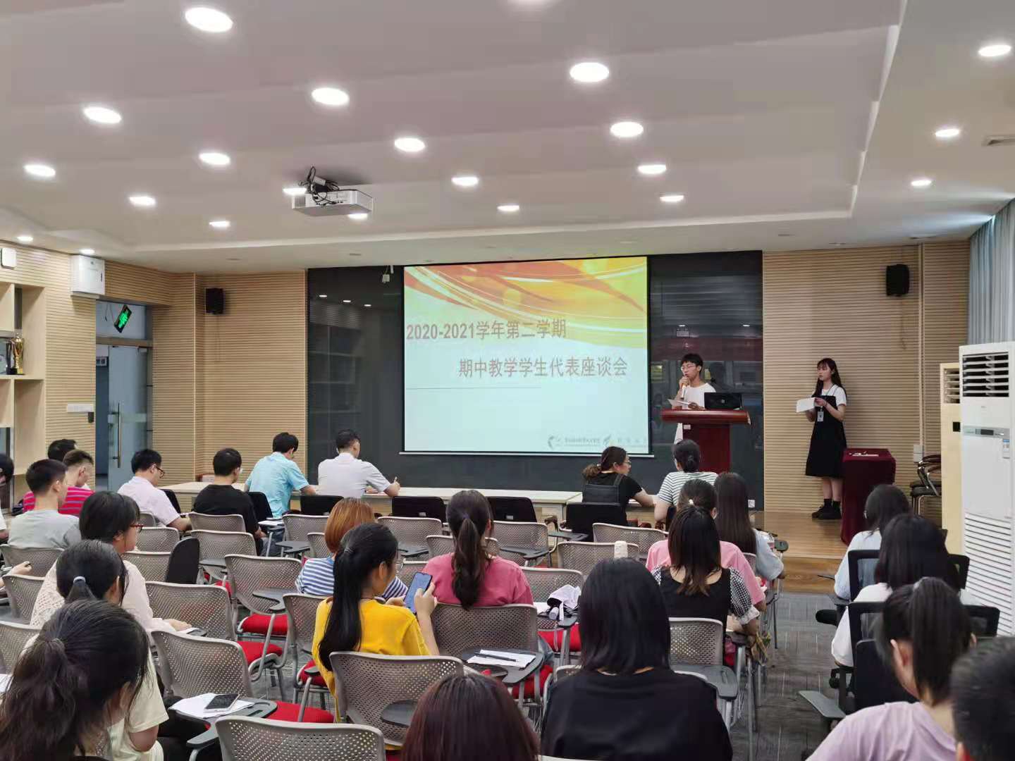 会上,各班级学委依次上台发表了各班对于任课教师教学上的不足之处和教学上的建议。各教研室老师听取了意见和建议后,也跟学生在会上直接交流,仔细听取学生提出的建议。