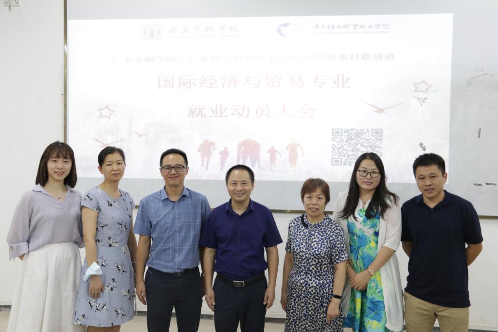 为了推进国贸联培班的就业工作,在财贸学院与广东金融学院经贸学院的合力推动下,于2021年9月10日上午在小礼堂顺利召开了国贸联培班就业动员大会。参加本次动员大会的嘉宾包括广东金融学院经贸学院院长卿前龙、党总支副书记钟兰、国际经济与贸易教研室主任张海霞、党总支委员辅导员曾晓思,广东轻工职业技术学院财贸学院院长韩宝国、党总支书记杨伟柱、国际经济与贸易教研室主任肖威、专业老师邓志虹,财贸学院就业工作辅导员以及国贸联培班全体学生参加会议。
