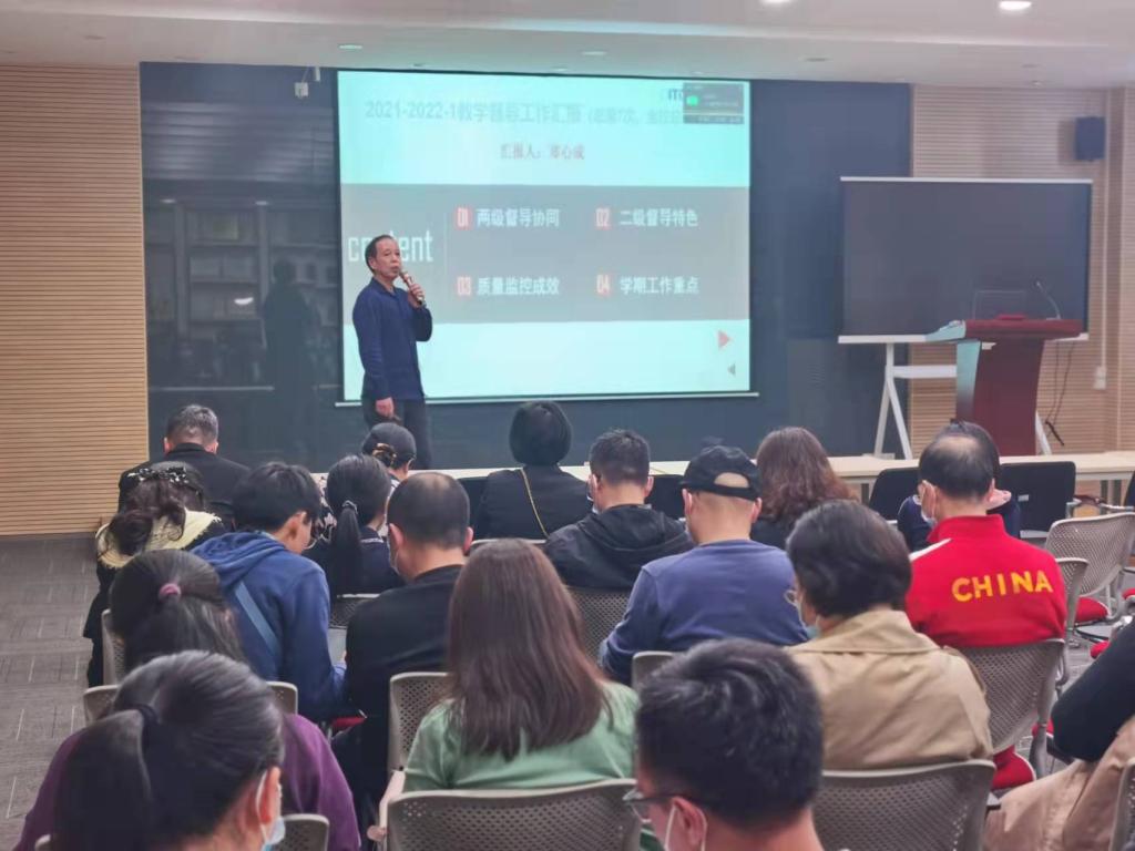 郑心成督导向学院老师报告2021-2022学年第1学期二级督导组的常规工作情况,包括开展温室计划、种子计划、共生计划、四星计划等常规工作报告。接着对教师课堂教学深度自评工作、学生评教、巡课听课、企业参与教学等工作做了汇报,重点说明了教师初级自评和深度自评的相关事宜,要求深度自评教师按时完成自评内容。