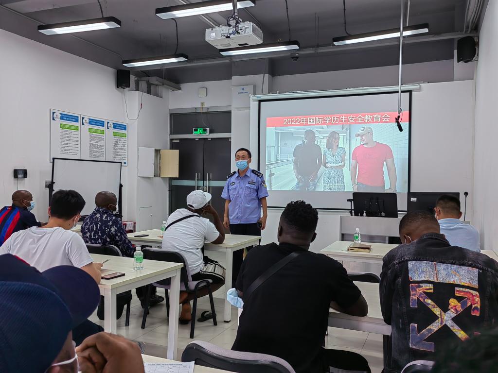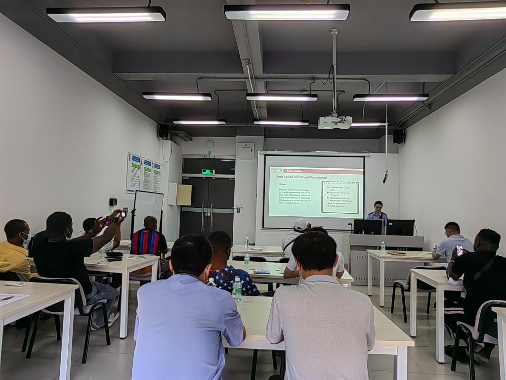 广州市公安局出入境管理局警官从签证类型、住宿登记、杜绝吸毒、酒后寻衅滋及其他事项进行了国内及国际方面的安全教育。海珠区派出所警官强调了中国的法律法规,要求大家要做知法、守法、懂法的人。并通过具体生动的案例提醒了在日常生活中应该注意的安全问题,进一步强化国际学生法律安全意识,提高自我保护能力。外事办科长王婷讲解了疫情防控、日常生活等方面的安全教育。