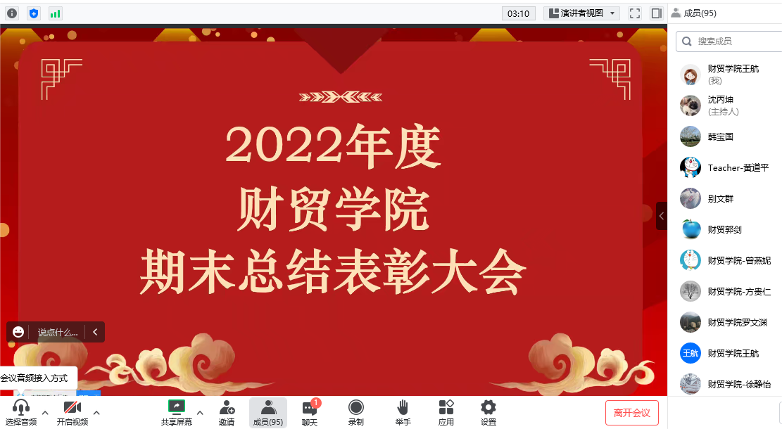 2023年1月3日上午,财贸学院院长韩宝国在腾讯会议上主持召开了财贸学院2022年度期末总结表彰大会。
