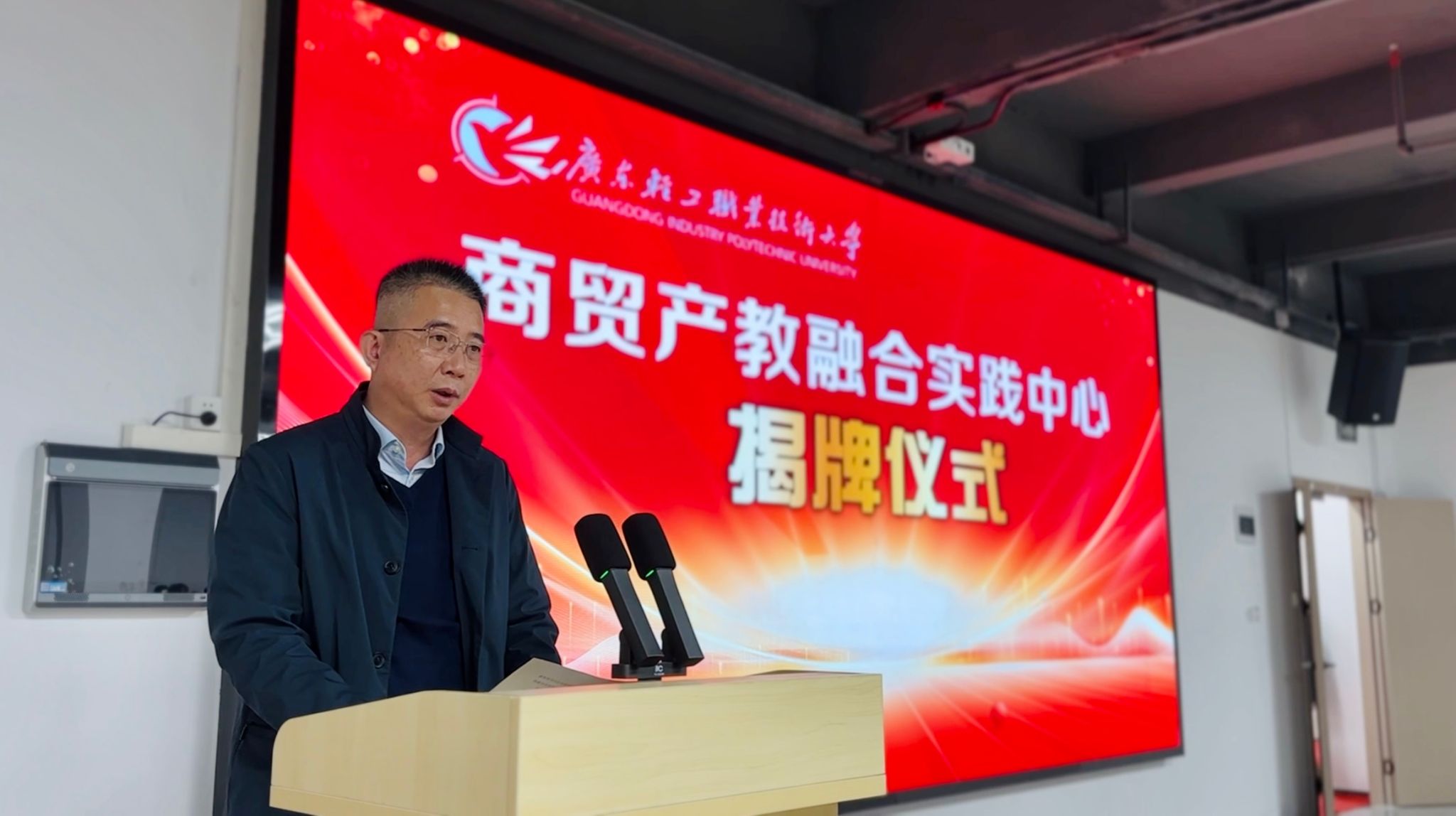 揭牌仪式上,邓毛程副校长进行致辞并对到来的各位嘉宾表示欢迎。他指出,商贸实践中心的成立是广轻大深化产教融合、推进教育教学改革的重要里程碑,也是学校与企业合作共赢的新起点。学校始终以习近平新时代中国特色社会主义思想为指导,积极响应国家“双高计划”建设和“十四五”规划的要求,聚焦数字经济时代轻工业转型升级,致力于培养高素质商贸人才。同时,邓毛程副校长对广东中宏产业投资有限公司等企业在商贸实践中心建设过程的贡献表示衷心感谢。