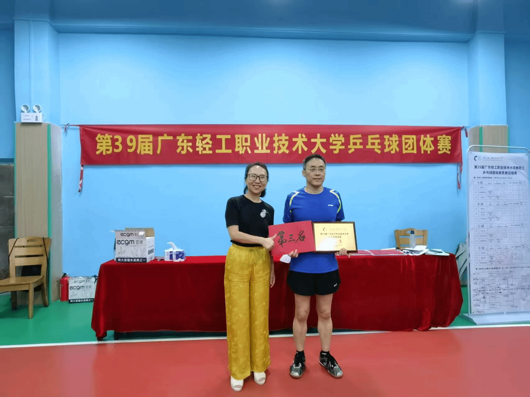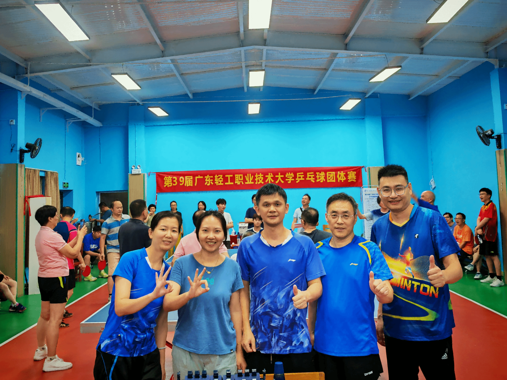 学院教职工乒乓球队队长、教练兼男队员谭汝聪带领男队员李向升、李胜刚、崔益峰,女队员余海冰、杨潇潇、邓志虹、张禾、曾燕妮,充分发挥财贸学院力争上游、顽强拼搏的团队精神和集体荣誉感,凭借精湛的球技,以小组第一名出线,最终荣获校第三名。
