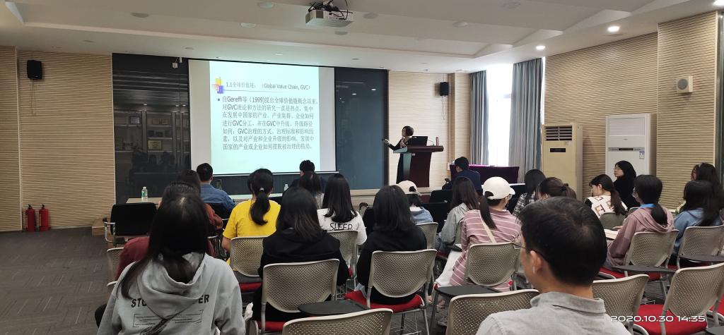 李飞星教授结合自身十几年全球价值链(GVC)的研究,对当前国际分工的格局和全球价值链、区域价值链延伸现状进行了介绍。从全球价值链、区域价值链、国内价值链三个方面进行了分析,给广大师生深入浅出地介绍了价值链的发展与延伸过程,并分析了全球价值链(GVC)对世界国际分工格局的影响,区域价值链崛起的原因与条件,重点分析了区域价值链崛起对发展中国家的影响。接着详细地介绍了GVC的特点与GVC的重构内容,生动地展示了全球价值链延伸过程中的区域分工、产业环节分工现状,中国制造在GVC中的优势与瓶颈以及存在的机遇,进一步引发了广大师生的深度思考。最后,李飞星教授就目前的形势总结国家构建区域价值链(RVC)的战略与路径,分享了“微笑曲线”“彩虹曲线”等相关知识,进一步丰富了大家对区域价值链的认知。