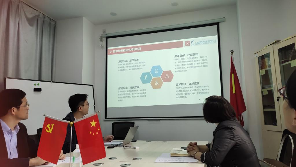 广东省电信规划设计院有限公司是我校的合作企业,双方一直就智慧教育的内容和方式进行合作探索,希望能够将“智慧教育”、“智慧文化”、“智慧校园”形成样板推广到全国甚至“一带一路”国家。交流会上,广东电信规划设计院有限公司李锦瑞和王伟邦介绍了他们对于打造更加高效便捷全面的智慧校园系统的新构想,各位老师对于这个系统中提出的创新点给予了高度的肯定,并分析了目前一些智慧校园系统中存在的不足,在此基础上提出了适应新时代的模块需求,以期进一步完善智慧校园系统,并能够形成示范效应。校企双方达成了进一步合作的共识。