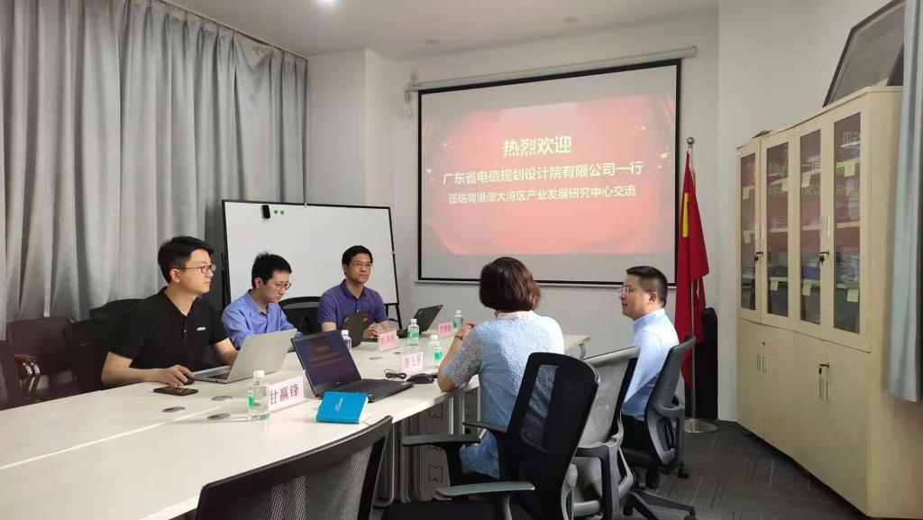 2021年3月19日上午,广东省电信规划设计院有限公司李锦瑞经理、王伟邦高工、蚁泽纯高工一行莅临广东省普通高校重点人文研究基地——粤港澳大湾区产业发展研究中心交流。基地负责人李飞星教授、魏国平副院长、陈钰博士、甘赢锋老师热情地接待了李经理一行。