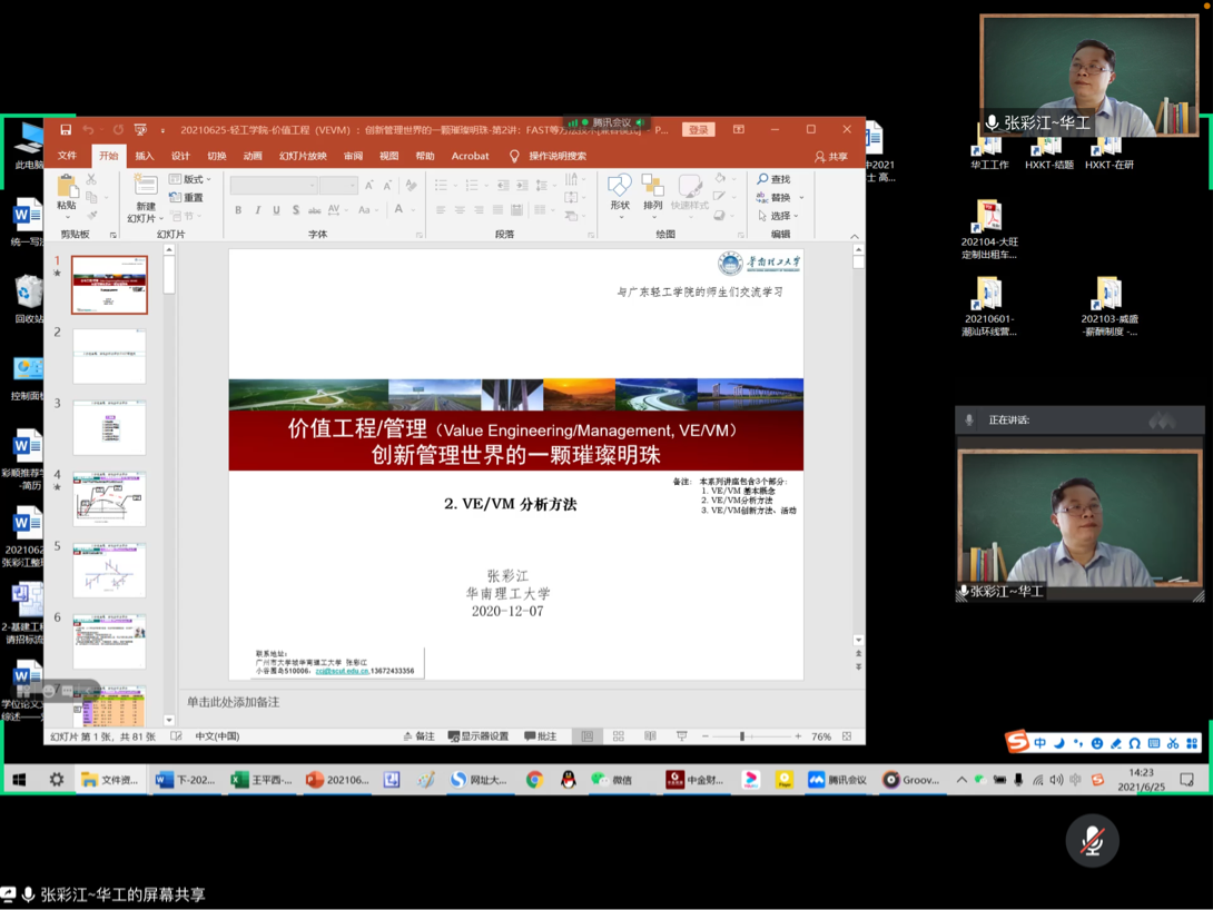 2021年6月25日下午,粤港澳大湾区产业发展研究中心通过腾讯会议举办了第九期线上学术讲座。此次讲座的主讲人是来自华南理工大学经济与贸易学院的张彩江教授/博士后、博士生导师,张教授分享的主题是“价值工程/价值管理分析方法”,李飞星教授主持了本次讲座。参加学术讲座的有来自财贸学院的师生,其他学院的老师,部分行政干部,参与人数近200人。