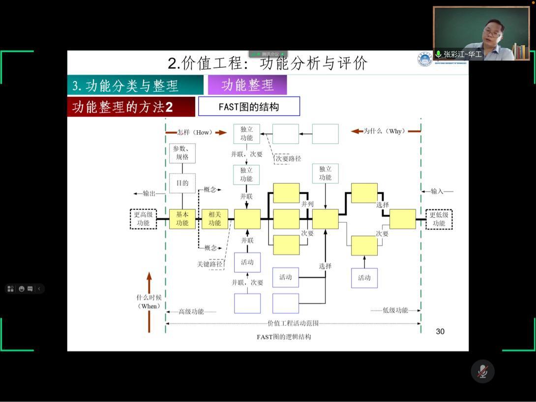 张彩江教授首先介绍了价值工程的基本概念,包括对象的选取办法、选取标准,接着详细介绍了市场生命周期法,决策树法,经验法,百分比法和ABC法等分析办法,并且结合具体案例分析了解决方案。张教授从价值工程的功能识别、功能分类与整理,功能计量,功能评价等四个方面进行讲解,重点介绍了结构——功能分析方法,功能分类和整理的六种方法,并结合中国VE/VM的实践,深入剖析了VE/VM在中国的社会经济发展中的广阔前景,积极引导师生探索和实践价值工程的创新方法。