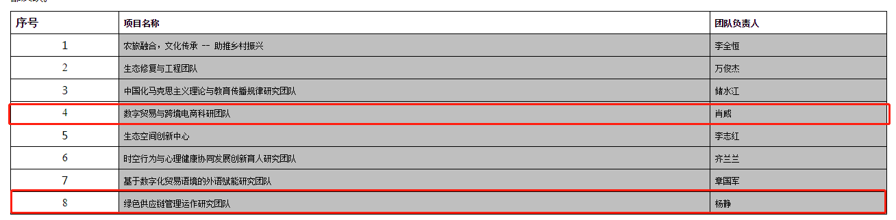 2021年12月,根据《广东轻工职业技术学院校级科研项目管理办法》和《关于组织申报2021年度广东轻工职业技术学院科研团队的通知》要求,经老师申报、二级学院、科学技术部初审、专家评审,粤港澳大湾区产业发展研究中心成员肖威老师立项数字贸易与跨境电商科研团队,杨静老师立项绿色供应链管理运作研究团队!