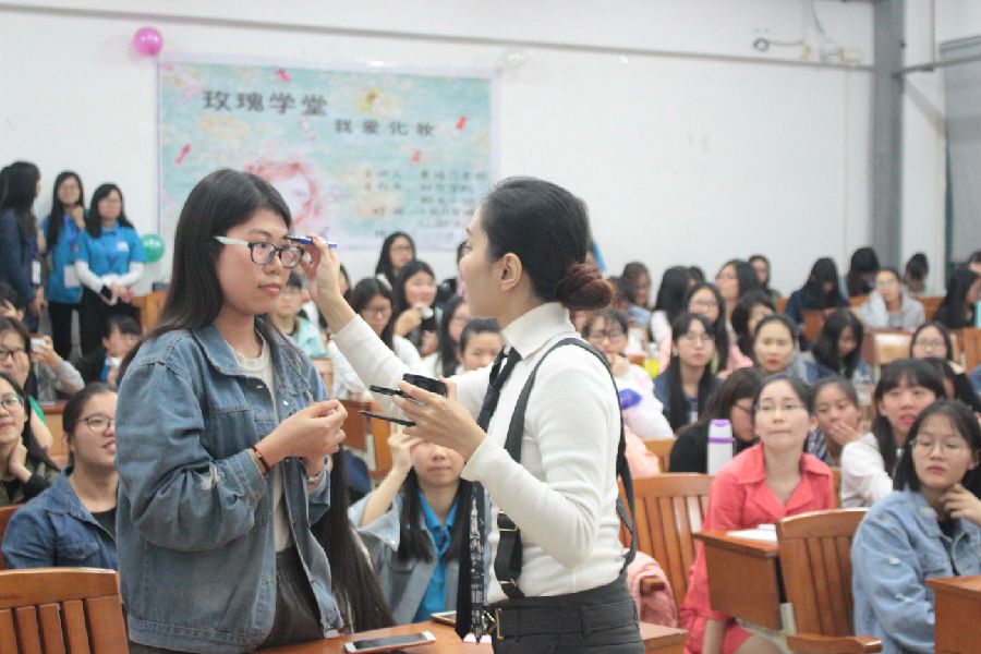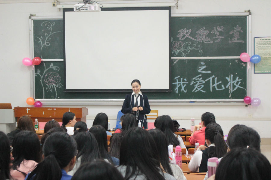 她用专业的知识和幽默风趣语言向学生们讲解了有关化妆品的知识,包括化妆品分类、化妆品的挑选、化妆的步骤等内容。