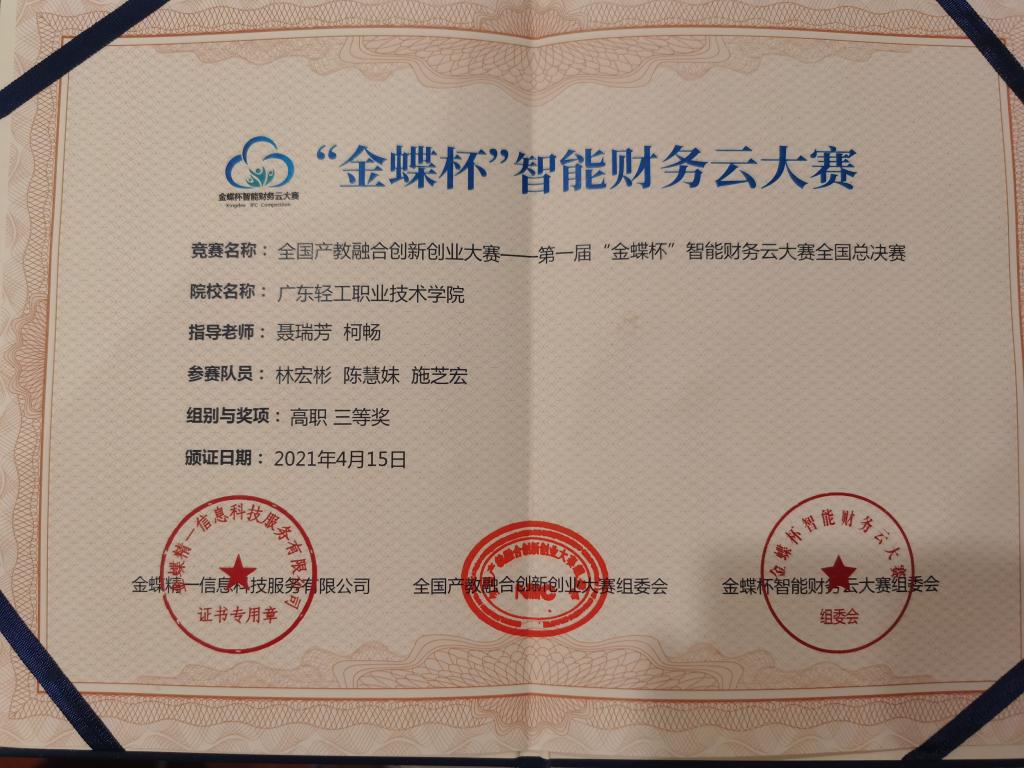 自2020年9月大赛报名启动以来,近 500 所专业实力雄厚的知名院校共8000余名学生进行实操技能的比拼,最后角逐出共 100支队伍晋级全国总决赛。在这场竞争激烈的比拼下,我校参赛团队在本次大赛中也取得了可喜的成绩。在我校聂瑞芳老师和柯畅老师的指导下,由澳财192班林宏彬、陈慧妹、施芝宏组成的广轻院一队荣获本次全国总决赛三等奖。