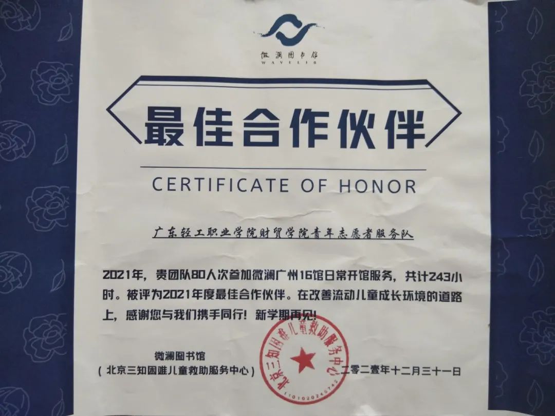 2021年12月31日,广东轻工职业技术学院财贸学院分团委财贸青志队在微澜广州年会上荣获“最佳合作伙伴”、“微澜16馆水滴奖——优秀团队”。