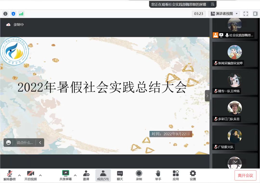 9月22日晚,财贸学院2022年暑期社会实践活动总结大会在腾讯会议圆满落幕,出席本次会议的嘉宾有财贸学院团委书记赖炜祎老师以及各实践团队成员和各学生干部。
