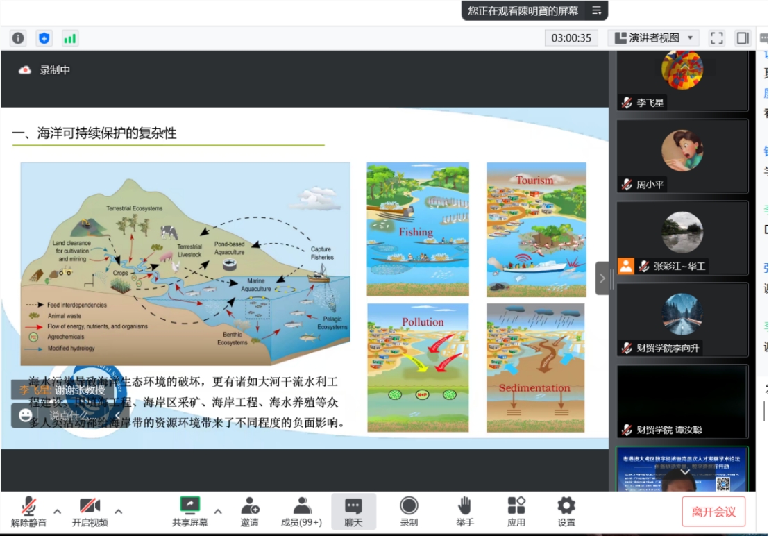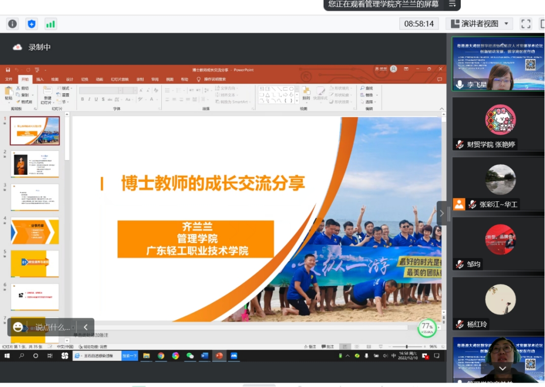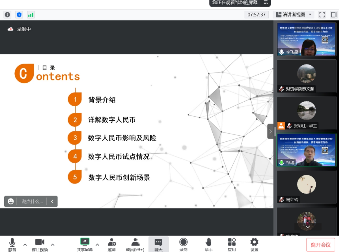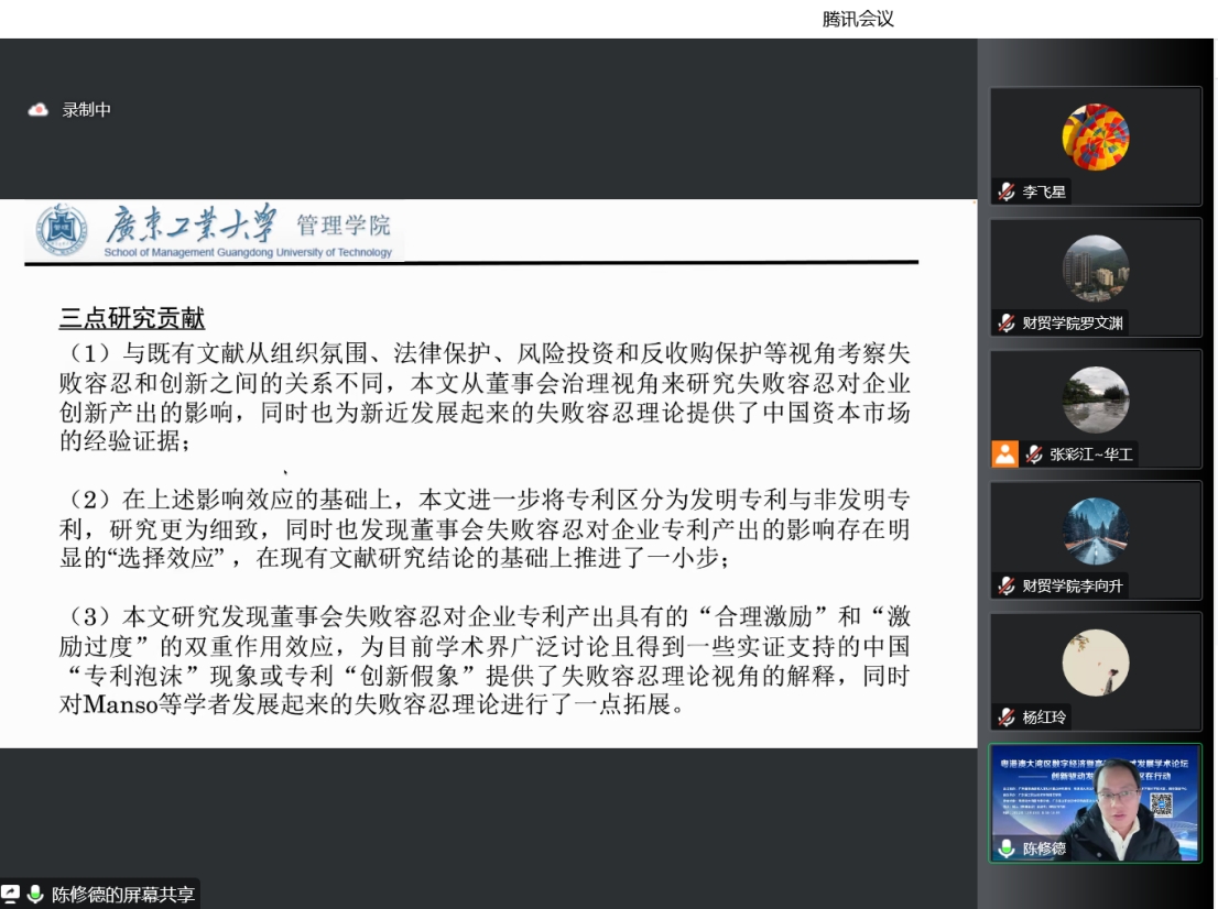 张彩江教授分享了数字经济的前沿,数字经济未来的发展方向和机会;陈明宝教授为我们分享了海洋经济的可持续发展,自然科学与社会科学的交叉研究;黄金波教授分享了大湾区的数字贸易、跨境电商方面的前沿动态;陈修德博士分享了董事会失败容忍对中国企业创新产出的影响;邹均博士分享了数字人民币基础知识和应用场景;齐兰兰博士分享了高层次人才在科研中的心路历程。