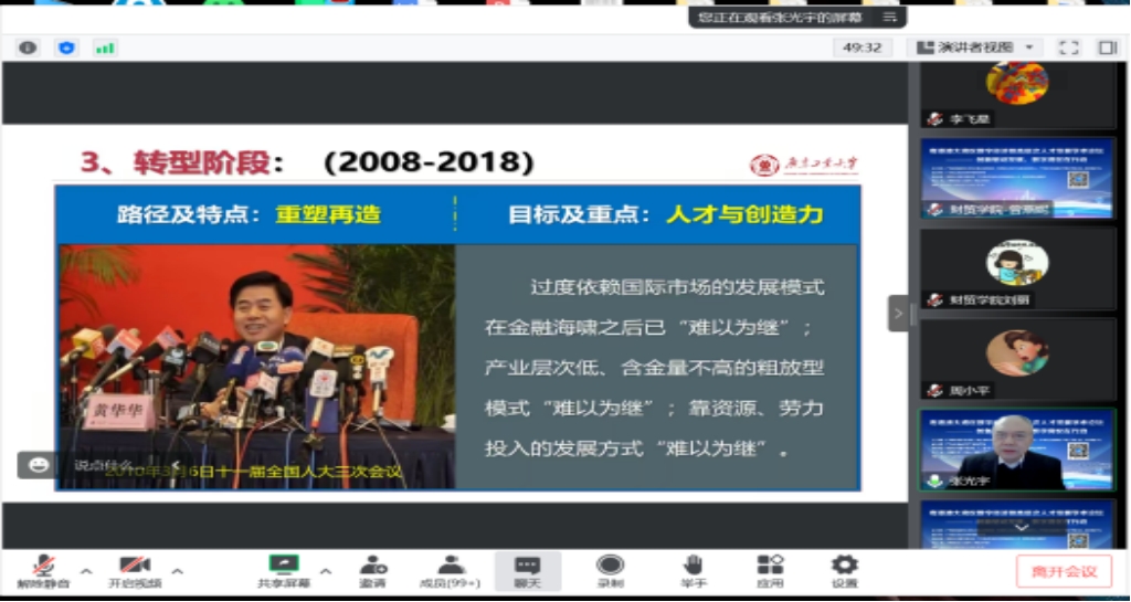 张光宇教授为我们分享了广东经济改革开放发展四十年与科技创新机制、创新人才资源的关系,广东发展的创新活力来源于科技体制创新和人才创新,广东未来的发展需要重视破墙出新,重视颠覆性创新技术的遴选、培育,人才在创新中的作用。