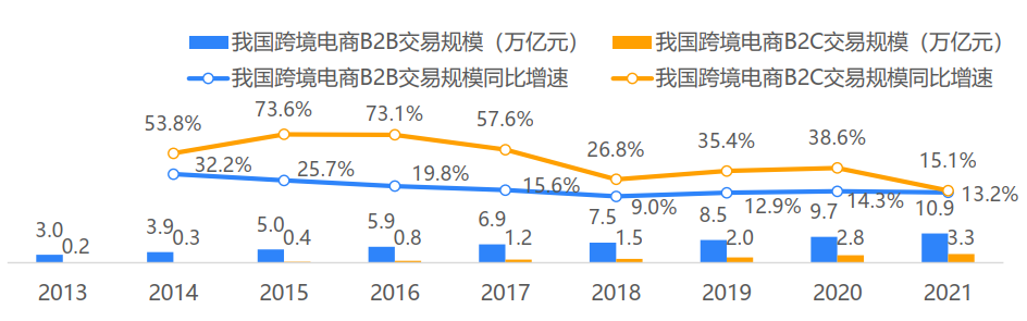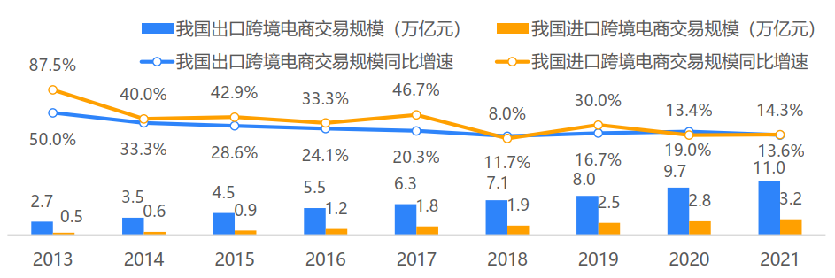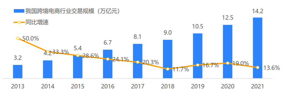 我国跨境电商交易规模保持高速增长态势,近5年CAGR(年均复合增长率)达16.2%。得益于国家支持政策的陆续出台、全球性物流网络体系的加速建设以及数字技术基础设施的持续完善,近年来我国跨境电商交易规模日益扩大,增速维持两位数以上。根据网经社数据,2021年中国跨境电商行业交易规模达14.2万亿元,同比增长13.6%。在全球贸易政策不确定性增加、亚马逊“封号潮”事件等风险因素下,我国跨境电商市场仍保持高速增长,活力和韧性强劲。