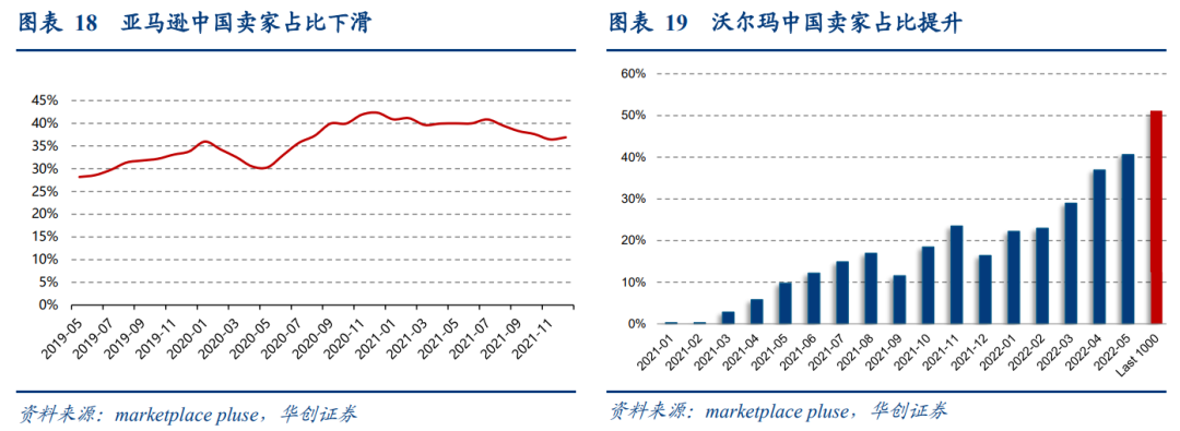 受亚马逊封号事件影响,头部商家中来自中国的卖家占比逐渐下降,根据marketplace pluse 数据,2021年12月中国卖家占比已降至36.9%,卖家洗牌影响渐入尾声,中国卖家份额下降趋稳。沃尔玛2021年3月于中国深圳宣布扩大中国卖家,新卖家中中国卖家占比逐步提升,5月已有超40%的新卖家来自中国。