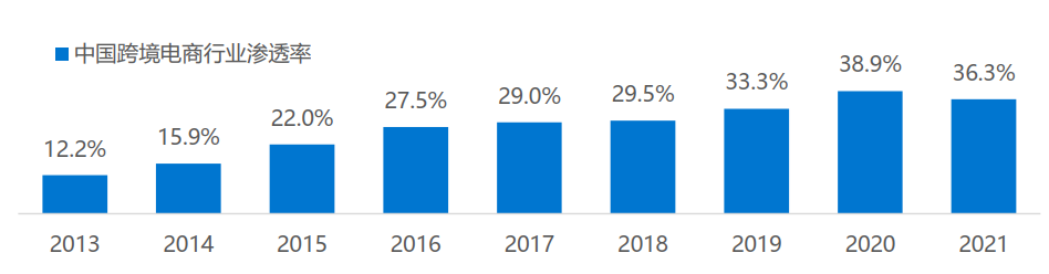 2021年我国跨境电商交易额占我国货物进出口总额的比例达36.3%,近5年提升7.3个百分点,传统外贸线上化转型趋势明显。在疫情防控常态化背景下,线上消费需求持续释放,跨境电商已成为我国稳外贸的重要力量。