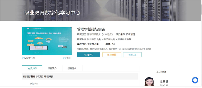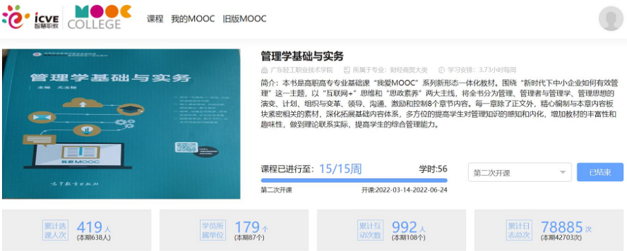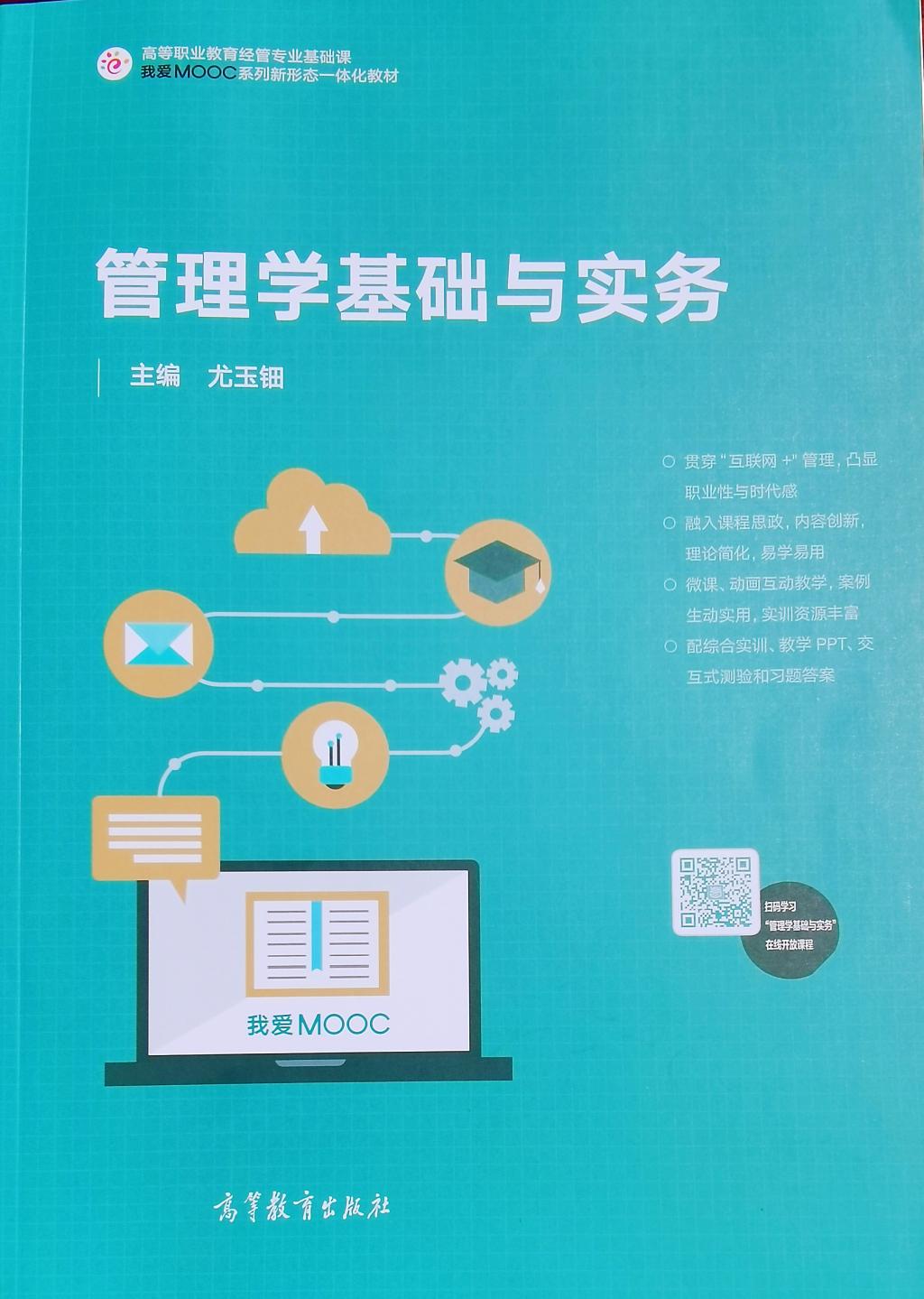 《管理学基础与实务》系高等职业教育经管专业基础课“我爱 MOOC”系列新形态一体化课程,校级精品在线开放课程与校级思政示范课程,国家职业教育智慧教育平台在线精品课。